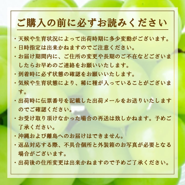 ※梱包工程に置いて最善を尽くし、丁寧に梱包しておりますが葡萄が脱粒する場合もございますので、ご了承願います。